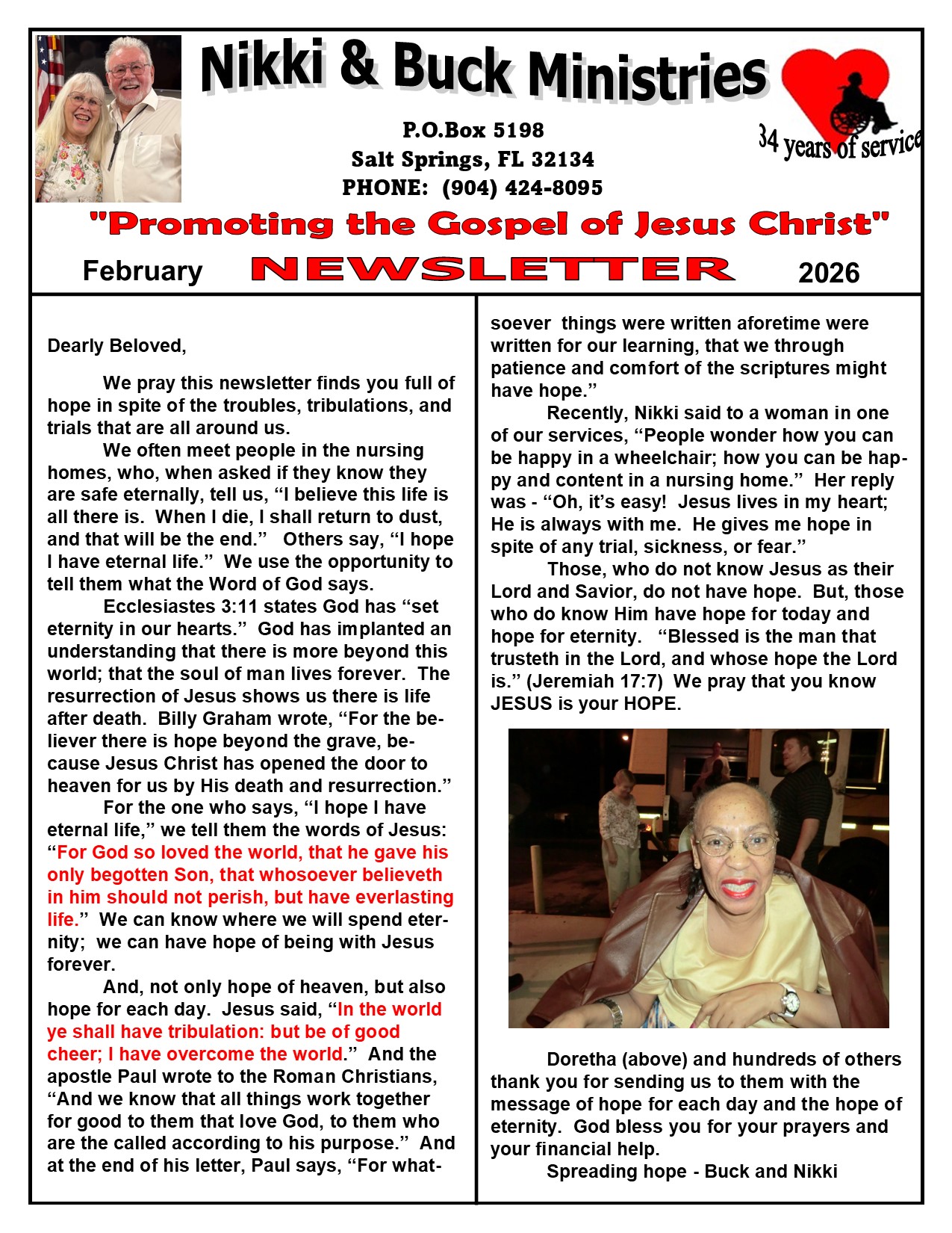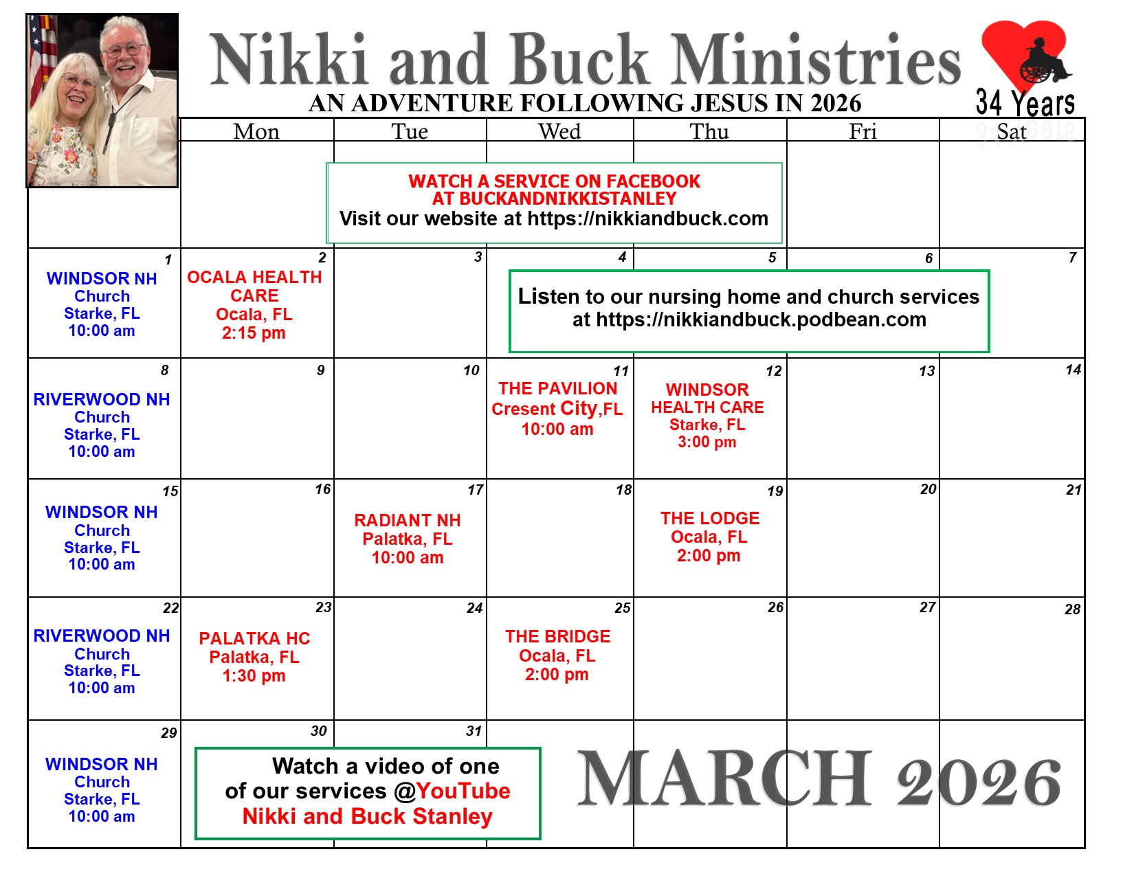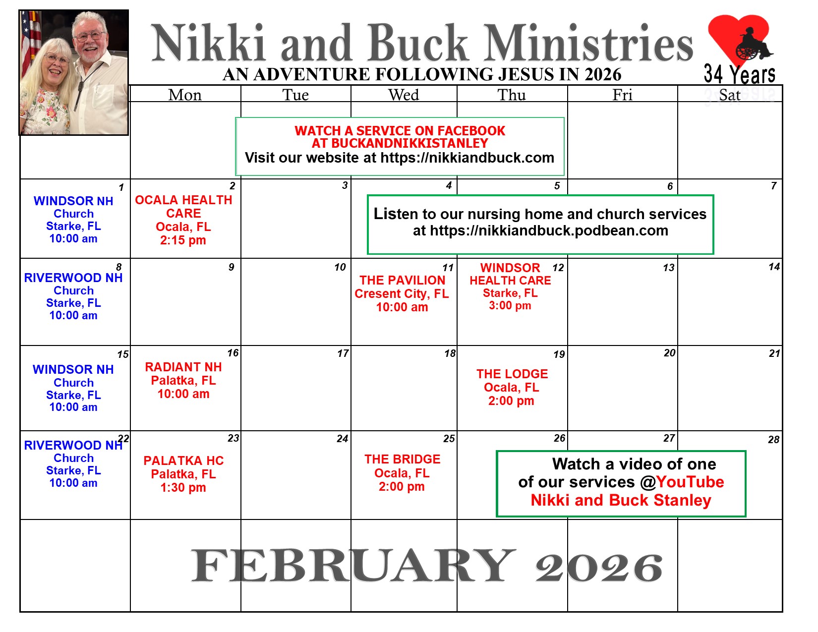 We are on a yearly schedule for worship services in 20 nursing homes, which comprise of West Virginia, and Florida.